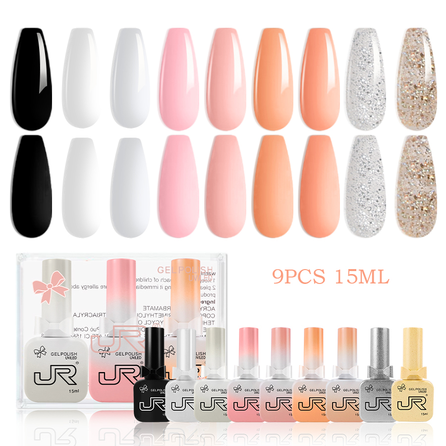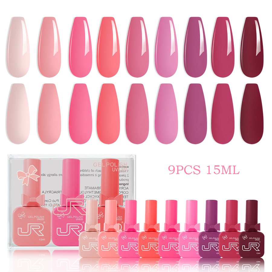 9pcs 15ml Gel Nail Polish Set with Red, Pink, Nude Shades & UV LED Soak Off