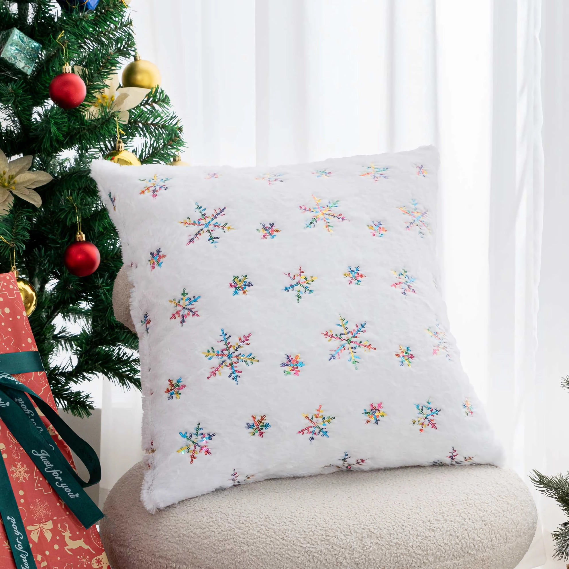 Christmas Colorful Snowflake Plush Pillowcase. This beautifully embroidered cushion cover, measuring 18 inches by 18 inches, adds a touch of festive charm to your living space. Made from a soft blend of polyester and cotton, it provides both comfort and style, making it the perfect addition to your holiday decor.