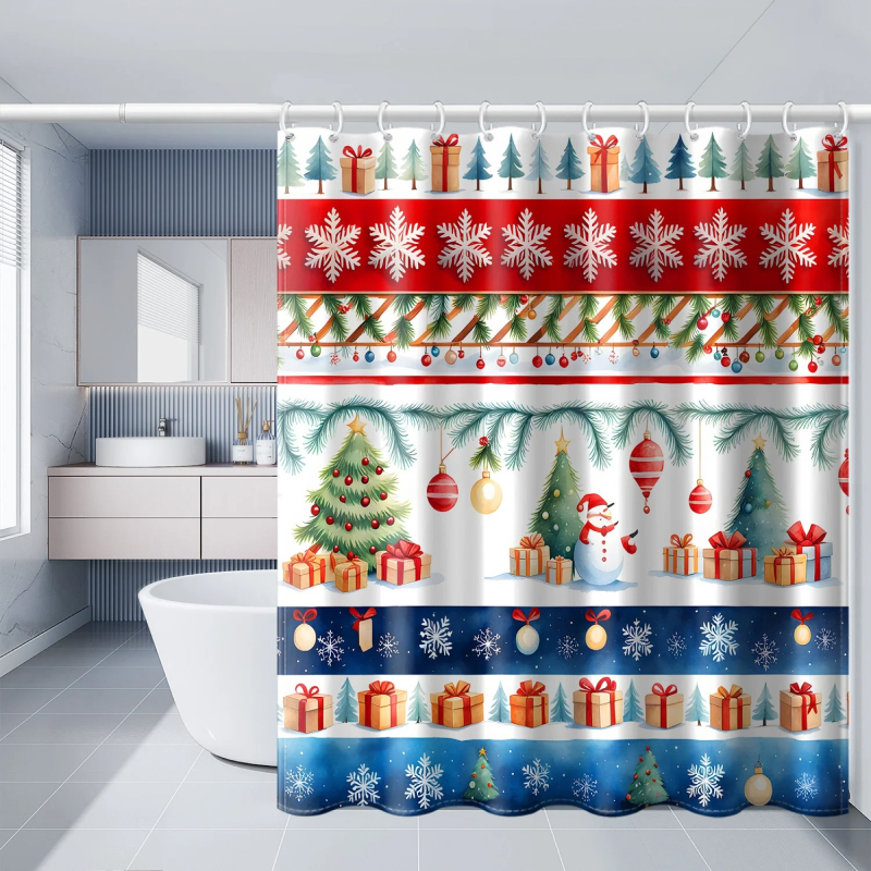 This shower curtain measures a generous 71 x 71 inches (180 x 180 cm), providing excellent coverage for your shower or bath area. The vibrant red and green colors, combined with whimsical snowflake designs, create a warm and inviting atmosphere, perfect for the holiday season. It comes equipped with 12 plastic hooks, making installation quick and hassle-free.