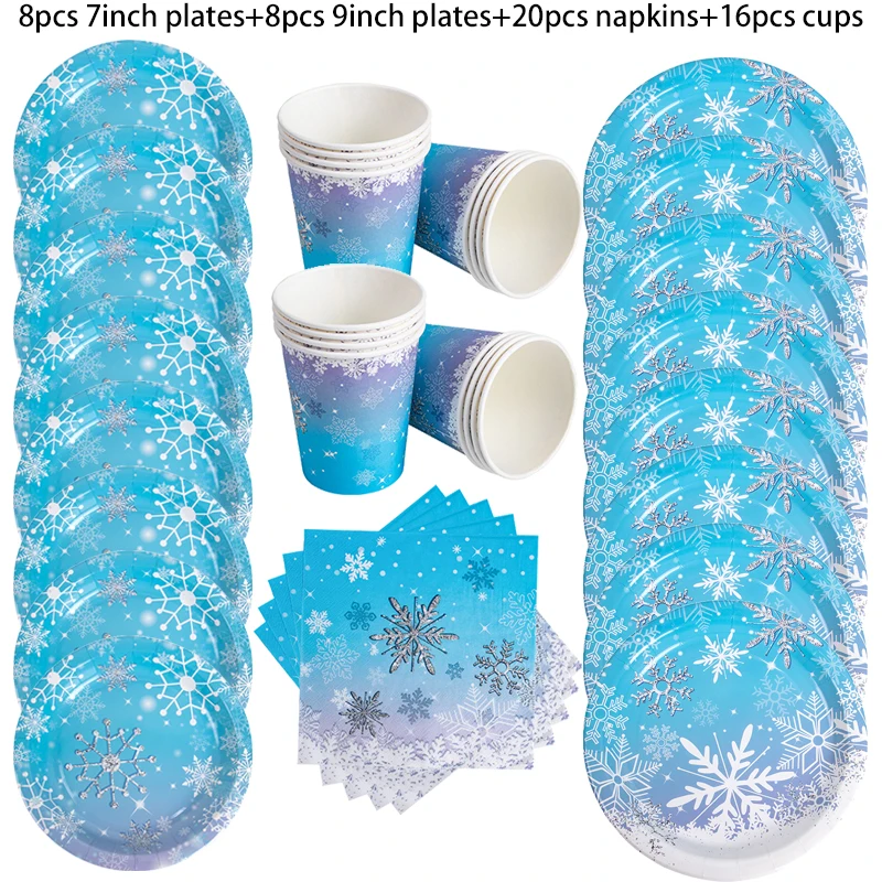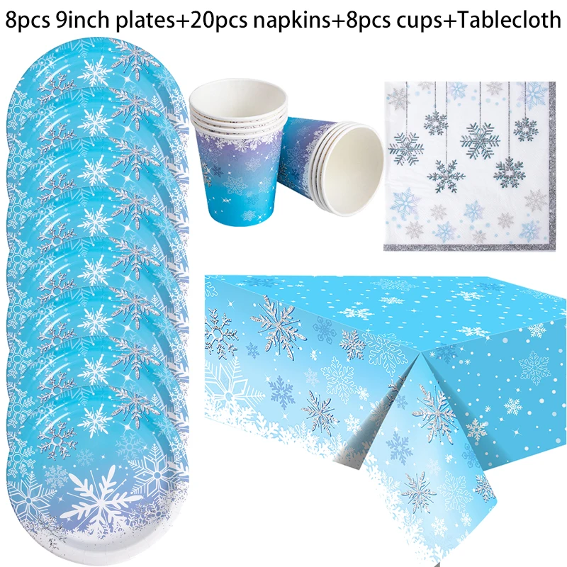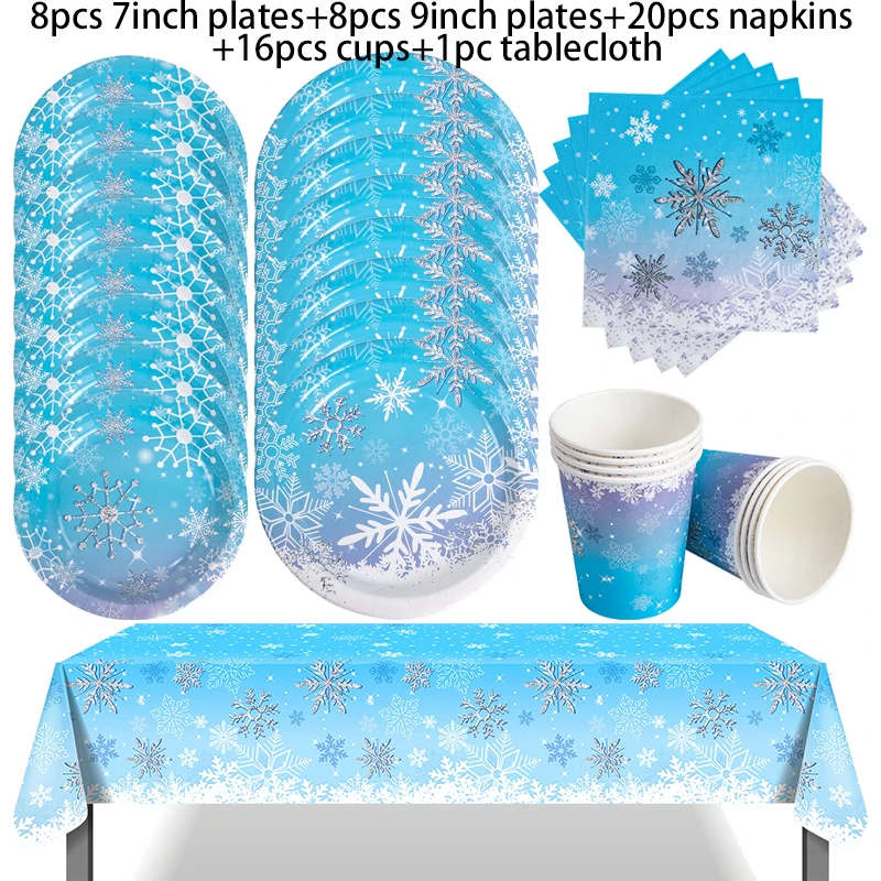 • Complete Table Setting: Includes 8x 7-inch plates, 8 cups, 20 napkins, and 1 set of snowflake banner to decorate and delight